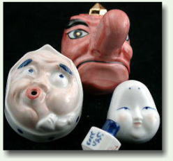今回ご紹介しますのは「可杯(べくはい)」というお座敷遊びで、「おかめ」「ひょっとこ」「天狗」をあしらった3種類の杯とコマ(サイコロ)が一つでセットとなった道具?を使います。「おかめ」はお酒の入る量が一番少なく、「ひょっとこ」はお酒の入る量がおかめより多く、口の部分に穴が開いているのでお酒を飲み干さないと穴からお酒がこぼれる仕組みになっています。「天狗」は3種の杯のなかで一番多くお酒が入り、長い鼻が邪魔してお酒が入ったままではテーブルに置くことが出来ません。コマは6面になっており、止まると杯と同じ3つの絵のうちいずれかが上を向くようになっています。