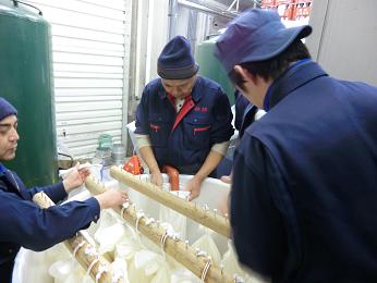 先日、「大吟醸山田錦」のつるし斗瓶取りを行いました。このお酒は毎年、全国新酒鑑評会に出品するお酒でもあります。今年は12月中旬から1月中旬までの1ヵ月間にタンク2本を仕込みました。
